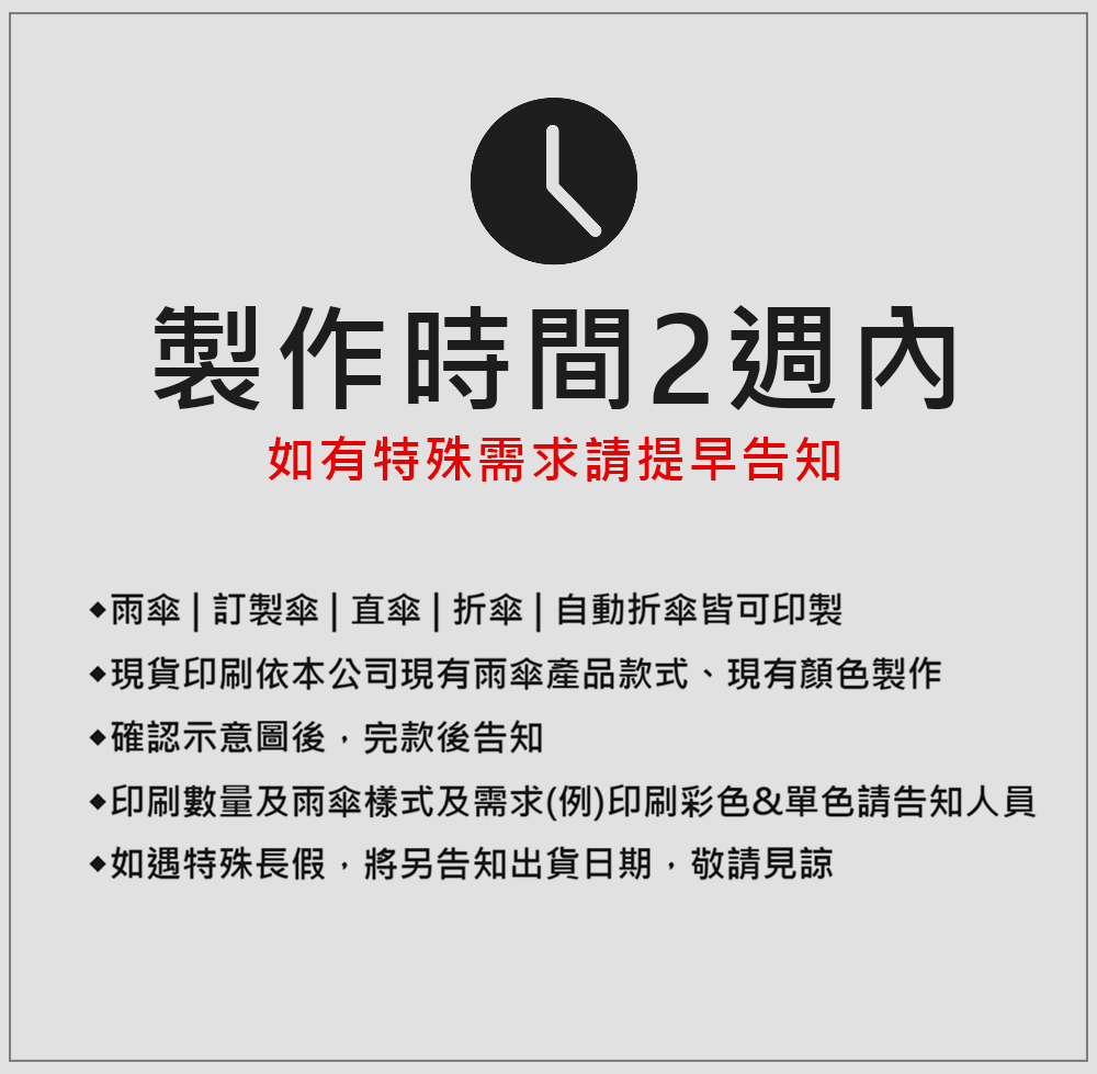 印刷可以依照您的設計顏色 , 單色及多色印刷 , 費用則價格不同。 支 ~300 支傘印刷有指定規格內;.